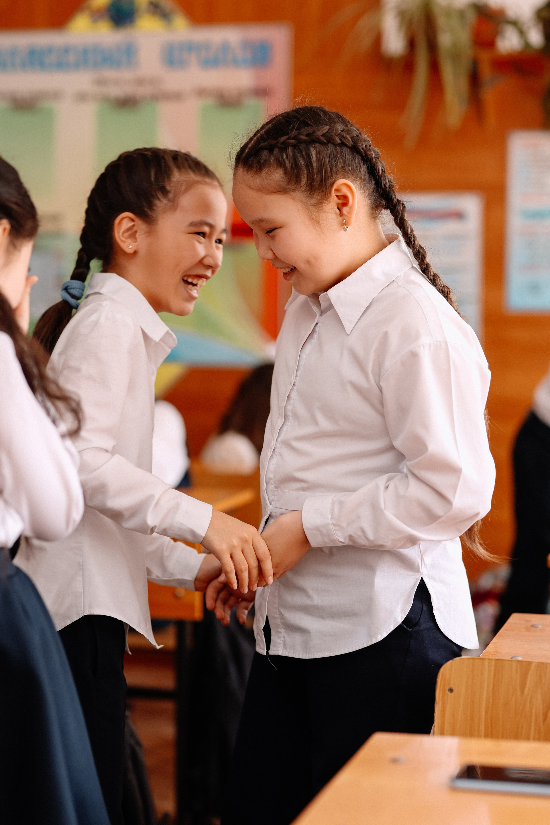 - Строгие костюмы у парней, платья у девушек.